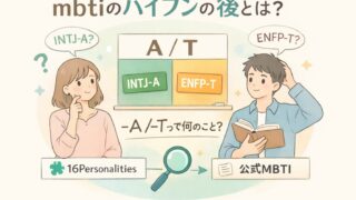 mbtiのハイフンの後に付く-A/-Tの正体を初心者向けに整理。identity指標の位置づけ、16personalitiesと公式MBTIの違い、ENFP-T/INTJ-Aの読み方まで解説。今日からmbtiのハイフンの後で検索迷子にならない。
